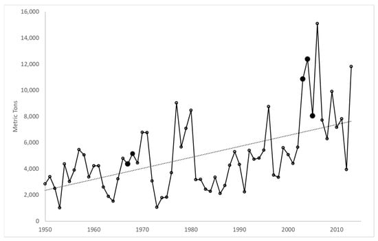 - NOAA. Fisheries Statistics: Commercial landings, Dungeness crab in Oregon from 1967–2010, NOAA Fisheries OST. 2012. Available online: www.st.nmfs.noaa.gov/st1/commercial/landings/annual_landings.html (accessed on 3 July 2012).