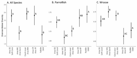 Shannon–Weiner diversity estimates (fitted values with 95% confidence intervals) in the habitat cluster for (A) all species, (B) parrotfish, and (C) wrasse. Letters adjacent to points are significance groupings based on post hoc multiple comparisons Tukey’s tests.