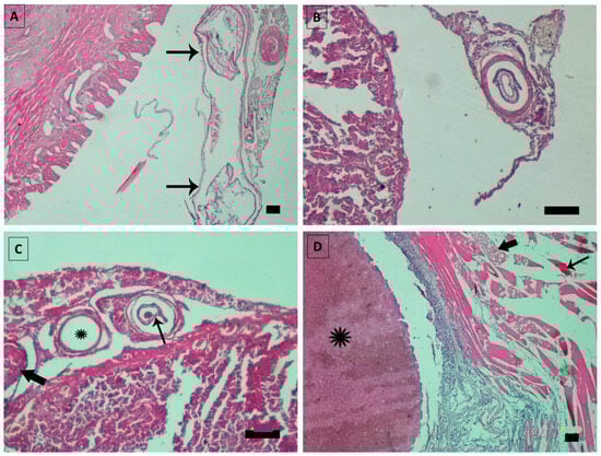 - Dezfuli, B.S.; Pironi, F.; Shinn, A.P.; Manera, M.; Giari, L. Histopathology and ultrastructure of Platichthys flesus naturally infected with Anisakis simplex sl larvae (Nematoda: Anisakidae). J. Parasitol. 2007, 93, 1416–1423. [Google Scholar] [CrossRef] [PubMed]