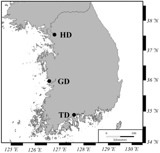 Three sampling locations for Chinese mitten crabs in Korea; HD = Han River, GD = Geum River, and TD = Tamjin River.