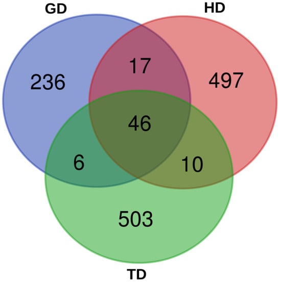 The 16S rDNA of the gut microbiome of the CMCs from three different habitats was sequenced. A total of 1,977,372 reads were generated from HD, whereas 1,778,436 and 1,645,806 reads were produced from TD and GD, respectively. The total read bases range between 495.4 Mbp and 595.2 Mbp. Table 1 shows the raw data statistics for each sampling site. The read length from all the three habitats was 301 bp, and a total of about 76% of the reads passed the input filter. These data indicate that the sequencing results were reliable and that all three datasets could be compared and analyzed. Subsequently, a total of 305, 570, and 565 ASVs were identified from the gut microbiota of GD, HD, and TD habitats, respectively. A total of 46 ASVs were shared by all samples, whereas the number of unique ASVs for GD, HD, and TD were 236, 497, and 503, respectively (Figure 2). Rarefaction analysis suggested that an adequate sampling depth was achieved for each sampling location (Figure S1). Additionally, in order to assess and compare the bacterial diversity in each location, bacterial richness and diversity indices were calculated from the proportion of ASVs. The microbial complexities in the guts of CMCs were estimated based on alpha-diversity indices (Chao1 and Shannon indices). The results indicate that the bacterial community in crabs from HD and TD showed higher alpha-diversity indices than those from GD (Table S4).
