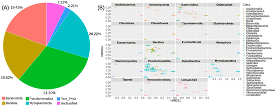 The overall microbial diversity identified by 16S rDNA metabarcoding. (A) The relative abundance of detected bacterial ASVs among the CMCs collected from 3 different sampling sites. (B) A multivariate analysis plot based on the Bray–Curtis distance and NMDS ordination.