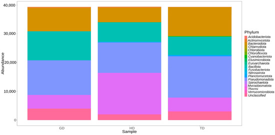 The gut microbiota of CMCs from three different sites mainly comprised bacteria belonging to four phyla, Pseudomonadota (31.3%), Mycoplasmatota (20.2%), Bacillota (19.6%), and Bacteroidota (19.4%). About 7% remained unclassified, and taxa with abundance <1% such as Acidobacteriota, Planctomycetota, and Chloroflexota were grouped as rare phyla (Figure 3). The relative distribution of four dominant phyla was similar at each sampling site; however, different abundance and variation trends show according to the locations. Specifically, we observe that Bacteroidota were more dominant in GD and TD compared to HD. In contrast, site HD showed more dominance of Mycoplasmatota than GD and TD sampling sites (Figure 4).