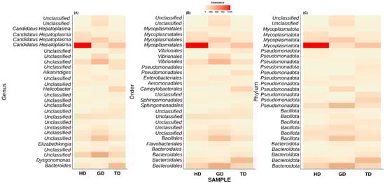 Next, we explored only those taxa that represent at least 1% of reads in at least one sample. This step resulted in the top 28 most abundant taxonomic groups (Figure 5). At the genus level, most of these ASVs could not be assigned to a well-defined taxonomic group (Figure 5A). Nevertheless, the genus-level abundance heatmap exhibited that Candidatus Hepatoplasma had significantly high abundance in CMCs retrieved from the HD sampling location (Figure 5A). Similarly, CMCs obtained from the GD sampling location showed a higher abundance of certain unclassified bacteria at the genus level. These unclassified bacteria mainly belonged to the order Bacteroidales, Bacillales, or Vibrionales (Figure 5B). Interestingly, the crabs collected from the TD sampling location displayed a higher abundance of Helicobacter than HD and GD sites. At the phylum level, the top 28 most abundant groups again represented Pseudomonadota, Mycoplasmatota, Bacillota, and Bacteroidota, although with varying abundance levels (Figure 5C). Additionally, two unclassified phyla showed dominance in the guts of crabs from GD sites. These results are in line with the previous studies which have identified these four phyla as the major groups in the CMC gut microbiome [10].