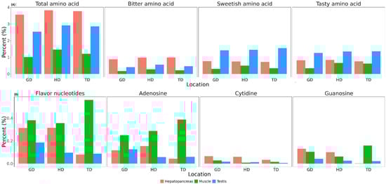 The total content of flavor nucleotides, including adenylic acid (AMP), guanylic acid (GMP), and cytidylic acid (CMP), was the highest in the muscle and the lowest in the testis (Figure 6B). The TD population showed the most flavor nucleotides in the muscle, while the lowest flavor nucleotides were found in the hepatopancreas. AMP was the most abundant in the muscle (Figure 6B), while CMP and GMP exhibited variations between different samples; their quantities were minute.