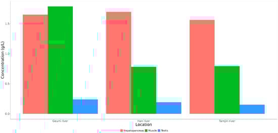 The lactic acid content in various tissues from the three locations was also compared in this study. The results revealed a difference in the lactic acid content among hepatopancreas, testis, and muscle tissues (Figure 7). Specifically, the lactic acid content was more enriched in the hepatopancreas and muscle tissues than in the testis of CMCs sampled from the three sites.