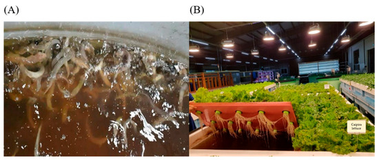 Panoramic photographs ((A): weather loach (M. anguillicaudatus, (B), Caipira lettuce (L. sativa)) in an aquaponics system based on biofloc technology (FP).
