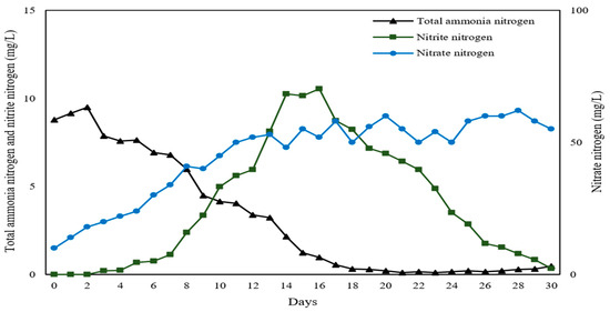 Additionally, the concentrations of total ammonia nitrogen (TAN), nitrite nitrogen (NO2−-N), and nitrate nitrogen (NO3−-N) were determined before feeding and analyzed every three days. This analysis was performed using an absorbance photometer (Merck KGaA, Darmstadt, Germany) along with an analytical reagent kit (Merck KGaA, Darmstadt, Germany), employing a colorimetric method.