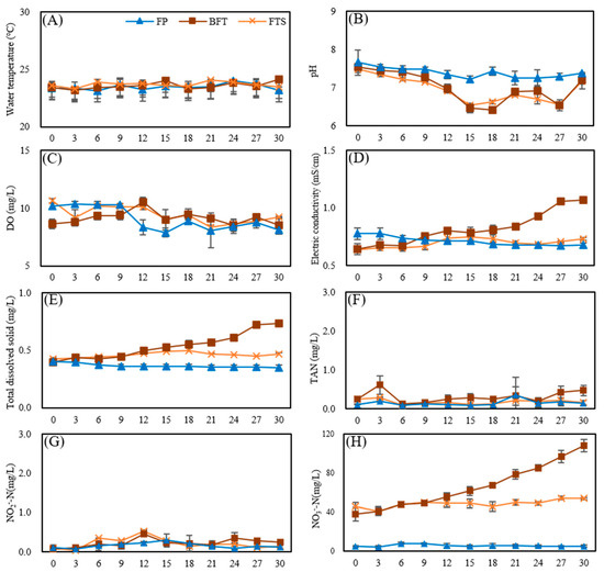 Changes in water quality in three aquaculture systems according to the experimental period ((A) water temperature, (B) dissolved oxygen, (C) pH, (D) electric conductivity, (E) total dissolved solids, (F) total ammonia nitrogen, (G) nitrite nitrogen, (H) nitrate nitrogen).