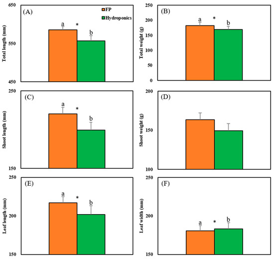 Comparison of crop productivity between the aquaponics system based on biofloc technology (FP) and hydroponics (HP) system after four weeks ((A) total length, (B) total weight, (C) shoot length, (D) shoot weight, (E) leaf length, (F) leaf width). The asterisk (*) with different letters indicates values are statically different (p < 0.05).