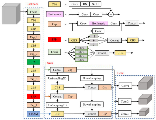 We make the following contributions: (1) The pretraining weights of the VOC dataset are migrated, positive sample matching is incorporated in the data encapsulation process, and the exponential moving average (EMA) [28] is added to the model training process. (2) To extract effective features, we improve the structure of the YOLOv5s network. Coordinate attention (CA) [29] and a convolutional block attention module (CBAM) [30] are integrated into the YOLOv5s backbone to form a coordinate–channel–space chain attention model, and the attention network model parameters are fine-tuned for the extraction of more effective and accurate features.