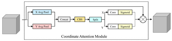 While extracting channel information, the CA mechanism performs one-dimensional feature encoding that is based on width or height. It first integrates the feature space position information, and then it aggregates the features in two directions. The long-term dependencies are obtained in one direction, and accurate coordinate information is obtained in the other direction, thus forming a pair of direction-aware and position-sensitive features. The CA module is shown in Figure 2.