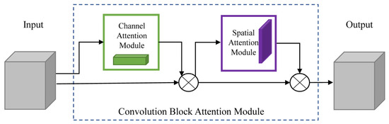 The convolution block attention mechanism forms an attention map in the channel and space dimensions in turn, and it performs element-wise multiplication of the attention map and feature map input from their respective dimensions, thus extracting a more effective feature structure. The CBAM module is added after the Csp_4 layer of the YOLOv5s backbone. The spatiotemporal attention module is shown in Figure 3.