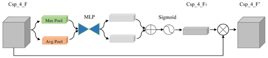 For the input Csp_4_F (20 × 20 × 512) channel number 512, the different pooling operations of global max pooling and global avg pooling are used to obtain two 1 × 1 × 512 richer high-level features, which are then input to the MLP (the number of neurons in the first layer is 32, while the number of neurons in the second layer is 512). We obtain two weights, and . We stack them to obtain the channel and space dual weights, and the channel attention map Csp_4_F1 is obtained through the activation function. The active function calculation formula is shown in Equation (8). The channel attention module is shown in Figure 4.