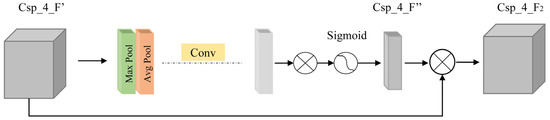 First, we input the result of bitwise multiplication of Csp_4_F1 and Csp_4_F (20 × 20 × 512) to global max pooling and global avg pooling based on channel 512 to obtain two 20 × 20 × 1 features. Second, we concatenate the two features (20 × 20 × 2). Finally, the spatiotemporal attention map Csp_4_F2 is obtained through a series of operations of convolution, activation, and bitwise multiplication with Csp_4_F’. The spatiotemporal attention map calculation formula is shown in Equation (9). The spatial attention module is shown in Figure 5.