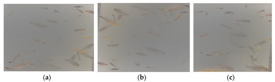 The zebrafish, as a model animal, has been widely used in the research of farmed fish. During the swimming process of fry, they are easy to gather and block, and their morphology changes greatly. Some fish bodies have the same color as the breeding environment, which makes it a great challenge to accurately detect fish fry in a real breeding environment [32]. The experimental data came from zebra fry with a length of 0.5–1.5 cm raised in a glass tank. Fish school images in a real breeding scene were taken by a mobile phone camera facing the glass tank every 5 s. LabelImg software v1.8.2 was used to label the data. Through basic image processing methods, such as rotation, flipping, and cutting, 692 items of experimental data were obtained, with a total of 15,081 fish fry. The random division ratio of the training, validation, and test sets was 5:1:1. The operations of the experimental data are shown in Figure 6.