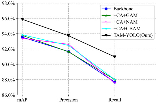 The CA model was added after the Csp_2 layer in the backbone of YOLOv5s, and the GAM model was added after the Csp_4 layer (designated model 2). Then, the CA model was added after the Csp_2 layer in the backbone, and the NAM model was added after the Csp_4 layer (model 3). In addition, the CA model was added after the Csp_2 layer in the backbone, and the NAM model was added after the Csp_4 layer (model 4). Model 4 was selected as the base model by comparing the performances of models 1–4. Model 4 has a 0.79% increase in precision and 0.33% increase in recall compared to model 1, a 0.83% increase in precision compared to model 2, and a 0.85% increase in precision and 0.46% increase in recall compared to model 3.