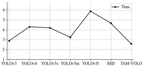 The mAP of the model in this paper is improved by 2.18%, 16.54%, 2.34%, and 1.41% compared to the YOLOv3, YOLOv4, YOLOv5s, and YOLOv5m models, respectively. Our model detects an HD image with a resolution of 1214 × 800 at a speed of 2.57/s, which is faster than the other models. The Yolov4 model does not perform well in detecting our dataset, with low detection accuracy and a high miss rate. The average accuracy is reduced by 0.07%, and the precision is improved by 0.98%, as compared to the YOLOv5l model, which is sufficient to verify the effectiveness of the proposed model. The depth of the YOLOv5s model is 0.33 of the YOLOv5l, and the width of the YOLOv5s model is 0.5 of the YOLOv5l. With fewer convolutional layers and parameters, the model performance is closer and the detection speed is faster. It is shown in Table 4, Figure 8 and Figure 9.