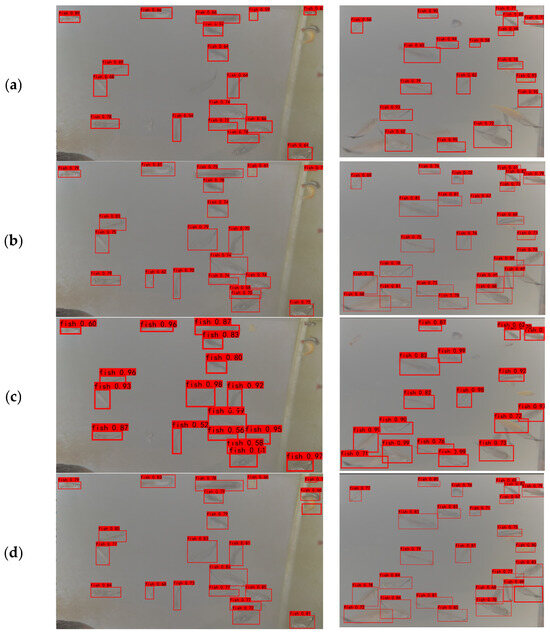 The results of the fish images detected by YOLOv4, YOLOv5s, SSD, and the model in this paper are shown in Figure 10. The fish detected by the model in this paper are more accurate and have a lower missed detection rate.