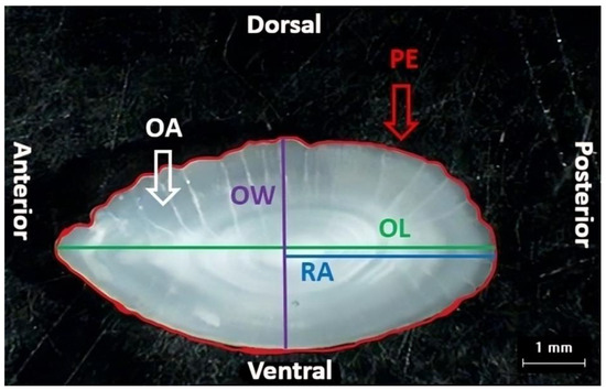 Based on the observations of the left sagittal otolith, the following otolith morphometric variables were recorded from the otoliths of both studied species: otolith area (OA, mm2); otolith length (OL, mm); otolith width (OW, mm); radius (RA, mm); perimeter (PE, mm) (Figure 2); roundness (RD) (the ratio between the actual area and the area of a circle of the same diameter; factor is larger if and when the shape of the otolith is more circular) [29] taking a minimum value of 1 [30]; circularity (CI) (provides information on the complexity of the otolith contour) [31] taking a minimum value of 4π [30]. Additionally, the following shape factors were calculated: form factor (FF) = ([4 × OA/PE2]) (a dimensionless value that indicates the similarity of the otolith contour to a circle, taking values from 0 to 1, with a value of 1 corresponding to a perfect circle); rectangularity (RC) = (OA/[OL × OW]) (which gives information about the approximation to a rectangular or square shape, indicating a perfect rectangle or square if it has a value of 1); and ellipticity (EL) = (OLOW/OL + OW) (reflects the similarity to an ellipse, with values close to 0 indicating a tendency towards circularity) [31].