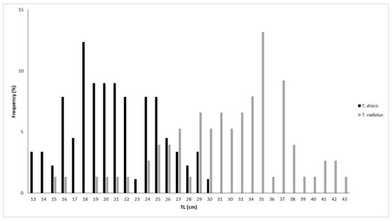 In total, 165 individuals were examined for this study, including 89 samples of T. draco and 76 of T. radiatus. The size of T. draco varied from 13.3 to 30.7 cm TL, while that of T. radiatus varied from 16.0 to 43.2 cm TL (Figure 3). T. radiatus presented greater sizes than T. draco as a result of the different known somatic types of the two species.