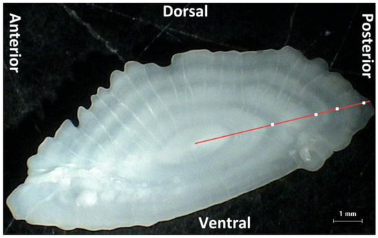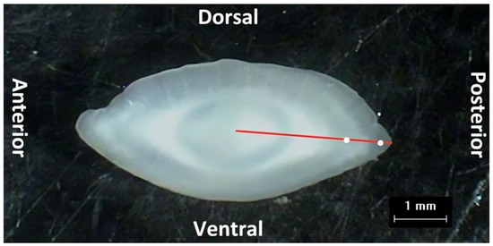 Counting the annual growth rings, defined as alternating opaque and translucent zones along the left sagittal otolith axis from the core to the post-rostrum edge, served as the basis for age reading by three independent readers. A second reading was conducted when readings differed to reach an agreement or to exclude an otolith in the case of disagreement. Otoliths that were broken or damaged were not used in the age determination or the examination of the morphometric parameters. The final number of otoliths that were used for age determination and otolith morphometrics were 86 and 68 for T. draco and T. radiatus, respectively. Regardless of the species’ spawning season, the date of birth was established on 1 January, in accordance with standards used by the great majority of fish age determination laboratories worldwide [27,28].