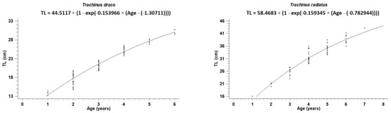 Based on the otolith readings, 6 (from 1 to 6) and 7 (from 1 to 7) age groups were identified from 86 T. draco and 68 T. radiatus, respectively. The first visible ring around the nucleus of the otoliths of both species was considered a false ring (Figure 4 and Figure 5). Table 1 displays the relevant age–length keys for T. draco and T. radiatus. The majority of T. draco belonged to age group two; T. radiatus to age group four. The von Bertalanffy parameters and the growth performance index Φ′ for each species are shown in Table 2 and the von Bertalanffy growth curves per species are presented in Figure 6.