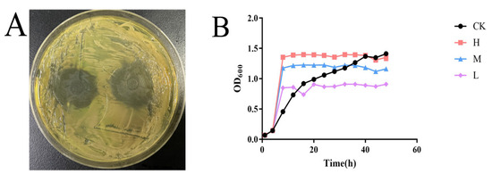Antibacterial effect of GX118 on A. salmonicida. (A): antibacterial zone; (B): growth curve by OD value. CK: control group; H, M, and L: growth of A. salmonicida co-culture with GX118 at a concentration of 1 × 109 cfu/mL, 1 × 107 cfu/mL, and 1 × 105 cfu/mL, respectively.