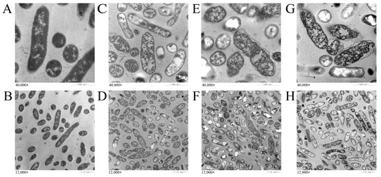 Electron microscopy observations on cell damage of A. salmonicida. (A,B): control. (C,D): co-culture of GX118 and A. salmonicida for 2 h; (E,F): co-culture of GX118 and A. salmonicida for 4 h; (G,H): co-culture of GX118 and A. salmonicida for 6 h.