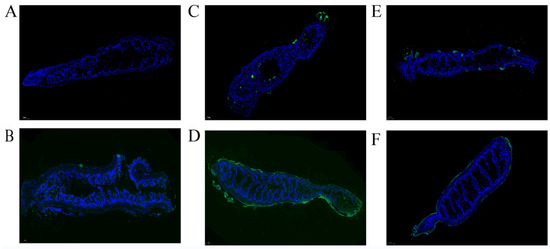 Fluorescence observations of intestinal sections. (A): control; (B–D): immersion infection of A. salmonicida for 6 h, 24 h, and 48 h, respectively; (E,F): the use of GX118 after immersion of A. salmonicida for 12 h and 48 h.