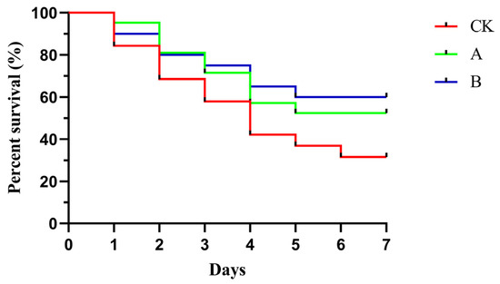 Survival rate of rainbow trout after A. salmonicida challenge. CK: control group; A: supplemented with 1 × 107 cfu/mL GX118; B: supplemented with 1 × 109 cfu/mL GX118.