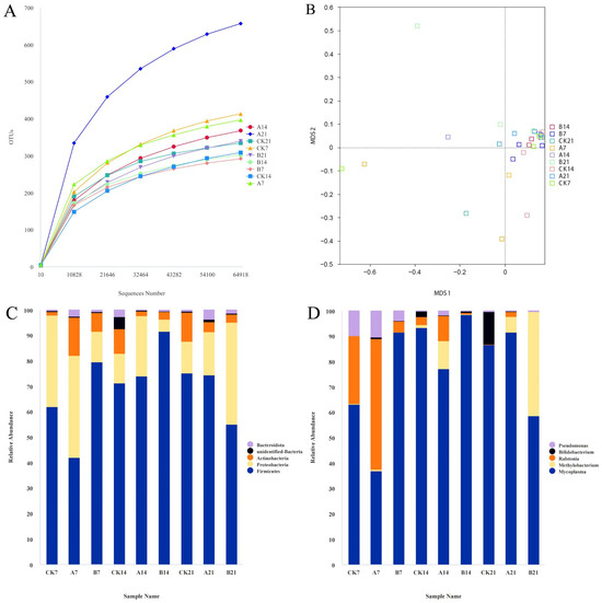 At the genus level, the dominant bacterial genera were Mycoplasma, Methylobacteria-methylorubrum, Ralstonia, Bifidobacterium, and Pseudomonas. Compared to the control group, experimental groups A and B had a higher abundance of Mycoplasma and Pseudomonas after 14 days, while the abundance of Mycoplasma and Pseudomonas decreased on day 21. The abundance of Ralstonia was observed to be comparatively reduced in group B compared to in the control group CK (Figure 5D).