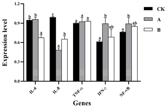 The relative expression levels of immune-related genes, IL-6, IL-8, TNF-α, IFN-γ, and NF-κB, in the kidney of rainbow trout were analyzed. After a 21-day feeding period, group B exhibited a notable reduction in the expression of inflammatory cytokines IL-6 and IL-8 when compared to that of the control group. Group A exhibited a notable decrease in the expression of inflammatory factors IL-8 compared to that of the control group. A notable enhancement in the expression of immune genes was observed in group A compared to in the control group, particularly of NF-κB and IFN-γ (Figure 6).