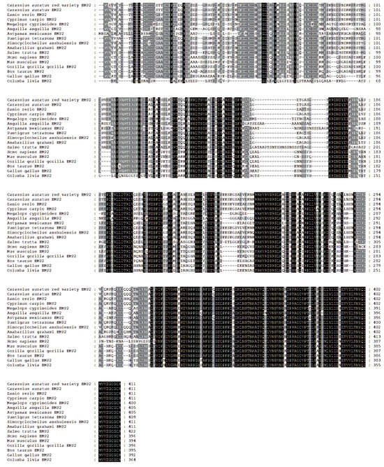 - Ma, L.X.; Dong, Z.J.; Su, S.Y.; Zhang, J.Q.; Liu, W.; Li, L.L.; Yuan, X.H. Cloning of fragments of bone morphogenetic protein gene (BMP2B) of Cyprinus carpio var. Jian and its expression analysis. Jiangsu J. Agr. Sci. 2013, 29, 370–378. [Google Scholar] [CrossRef]