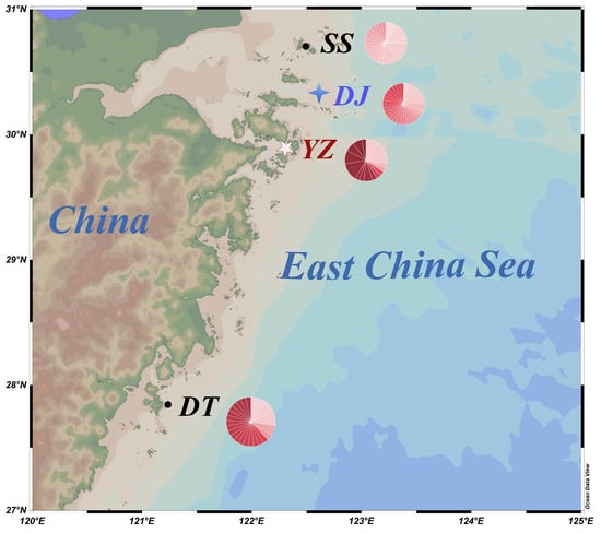 The picture shows the sampling locations along the coast of China. SS stands for Shengsi, DJ stands for Dongji, YZ stands for Xixuan and DT stands for Dongtou. The circle and blue characters represent the wild population, the four-pointed star and red characters indicate the mixed population, and the five-pointed star represents the farmed population. The pie chart represents the haplotype of this group, and the different colors represent the different haplotypes.