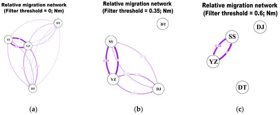 Directional relative migration networks of S. marmoratus populations constructed with online software divMigrate using Nm values above 0 (a), 0.35 (b) and 0.6 (c).