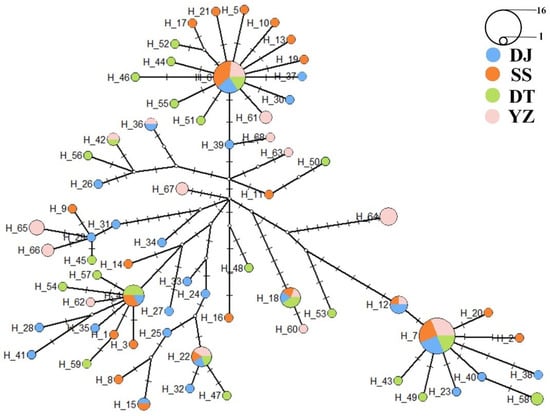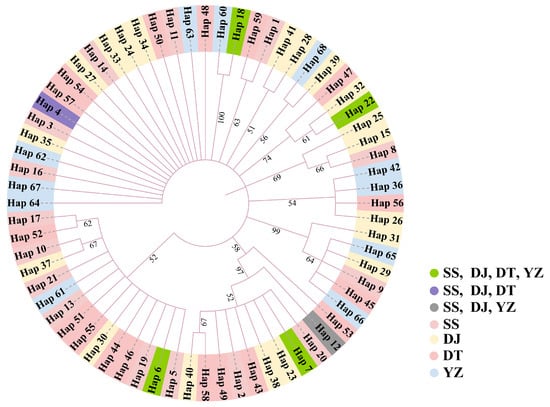 In addition, on the foundation of a star-like topological structure, haplotypes are predominantly distributed among three branches, namely Haplotypes 6, 7 and 18. Haplotype 4 is exclusive to the SS, DJ, and DT populations, while it is absent in the YZ population. No significant differences in haplotypes within these three branches were observed across the four populations (Figure 3). The phylogenetic tree based on the neighbor-joining method revealed a similar result with a star-like topological structure with no significant geographic agglomeration in the four populations. Based on population origin, the haplotypes from wild individuals tend to cluster together, as do those from individuals in the release area (Figure 4). The results of the neutral tests showed slight differences between the two methods. For Tajima’s D test, the calculated D values were −0.632, −0.412, −0.441, and 0.133 for the SS, DJ, DT, and YZ populations, respectively, with all p-values greater than 0.05. In Fu’s FS test, the calculated F values were −6.966, −11.579, −7.465, and −0.008 for the SS, DJ, DT and YZ populations, respectively. Tajima’s D value of the YZ population was greater than 0, while the other result of the neutral test was less than 0 (Table 7). Overall, the SS, DJ and DT populations exhibited significant negative selection.