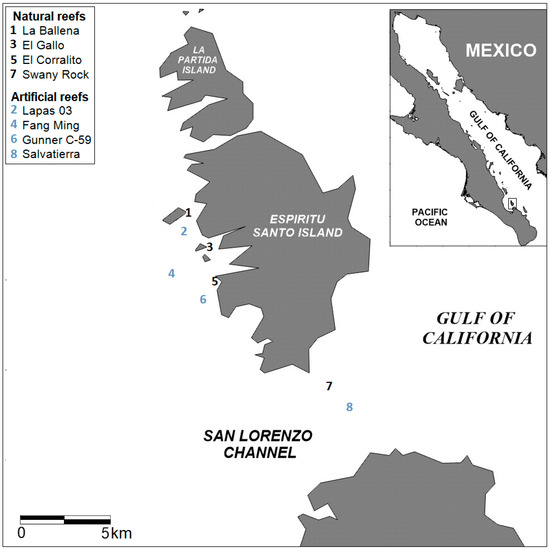 The Espiritu Santo Archipelago (ESA) area with its natural and artificial reef sites (enlarged): (1) Ballena Island (partially protected area); (2) Lapas 03 wreck (no-take area); (3) El Gallo (partially protected area); (4) Fang Ming wreck (no-take area); (5) El Corralito (partially protected area); (6) Gunner C—59 Francisco Márquez (no-take area); (7) Swany Rock (partially protected area); (8) Salvatierra wreck (unprotected area).
