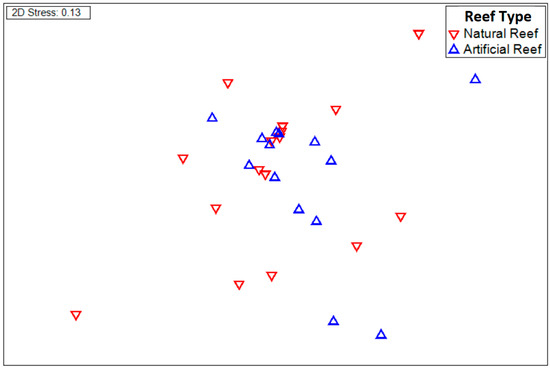 nMDS plot of the 32 ichthyoplankton samples of the different study sites, based on species abundances by reef type (natural reefs and artificial reefs).