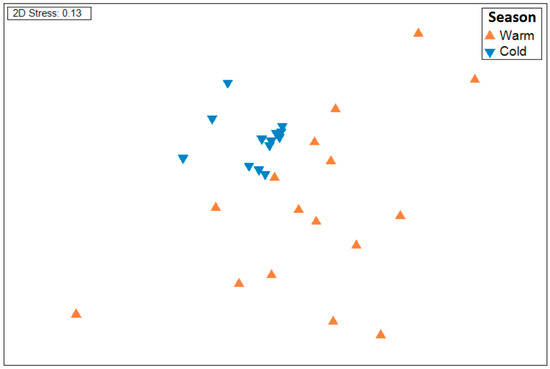 nMDS plot of the 32 samples of the study based on species abundances by season (warm and cold).