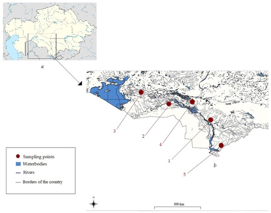 Sampling location of barbels; (a): Map of Republic of Kazakhstan; (b): Aral–Syrdarya Basin in Kazakhstan territory; 1–5: L. brachycephalus and L. conocephalus.
