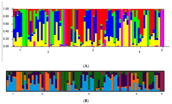 - Pritchard, J.K.; Stephens, M.; Donnelly, P. Inference of population structure using multilocus genotype data. Genetics 2000, 155, 945–959. [Google Scholar] [CrossRef] [PubMed]