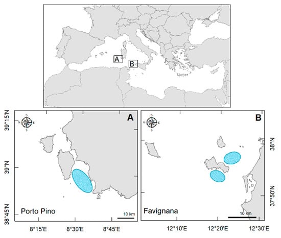 All fishing activities were carried out in two Italian marine areas: around Porto Pino (southwestern Sardinia) and Favignana Island (western Sicily) (Figure 1).