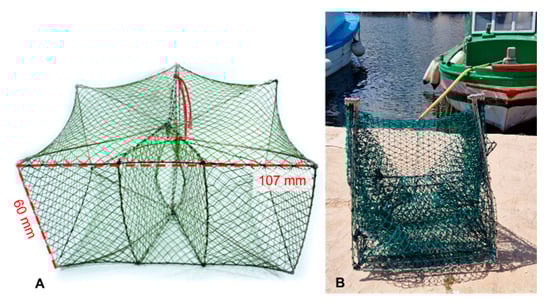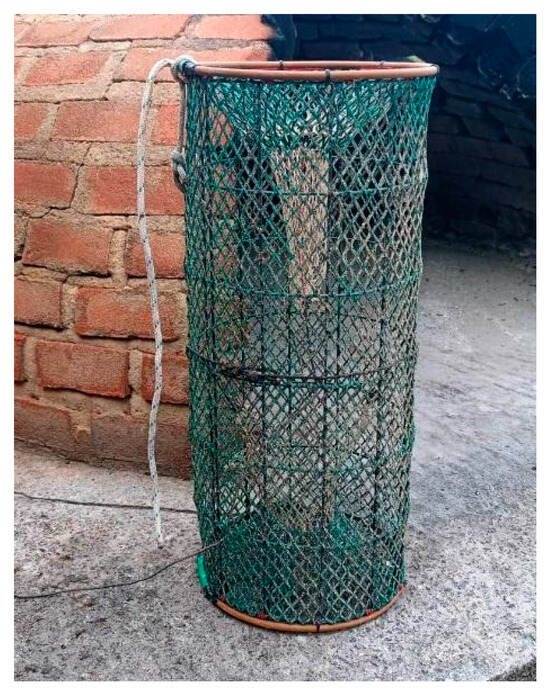 The traditional pots used by local fishers of Porto Pino are cylindrical in shape with a height of about 60 cm and a diameter of 30 cm, made with a metal frame covered with a nylon net of 10 mm mesh (Figure 3). This pot is mostly employed for catching octopus, during the spring–summer months, on mixed seabed at a depth between 40 and 60 m, using mainly crabs and, secondarily, sardines and discarded fish as bait [].