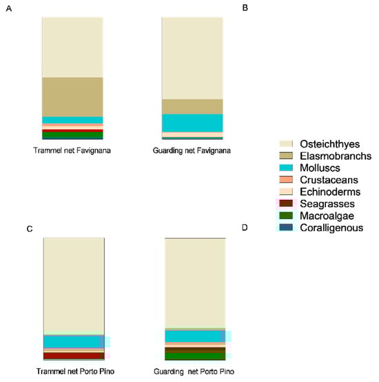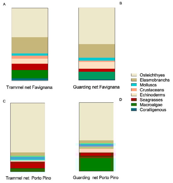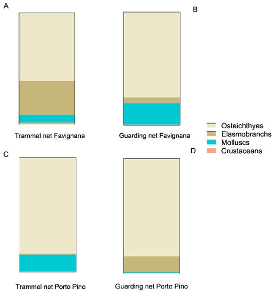 Osteichthyes were the most abundant group of organisms caught with both trammel nets in both study areas. In Favignana, this group accounted for 49.53% of total biomass with trammel net and 67.37% with guarding net; in Porto Pino, 79.14% and 73.57% of Osteichthyes were recorded with traditional trammel and guarding nets, respectively (Figure 5A,B).