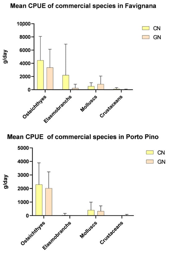 In Favignana, a total of 130.54 kg of commercial species have been caught with traditional trammel nets, of which 61.19% consists of Osteichthyes (mean CPUE = 4456 ± 3625.12 g/day). Elasmobranchs were the second most abundant taxonomic group, accounting for 30.26% (mean CPUE = 2203 ± 4702.87 g/day). In the case of the guarding nets in Favignana, a total of 80.195 kg of commercial catches were recorded, of which 75.53% constituted Osteichthyes, with a mean CPUE of 3336 ± 2771.13 g/day, followed by Molluscs, with 18.77% of total biomass and mean CPUE of 836.61 ± 1234.89 g/day, and Elasmobranchs (5.27% of total commercial biomass and mean CPUE of 234.77 ± 592.13 g/day) (Figure 7A,B; Figure 8).