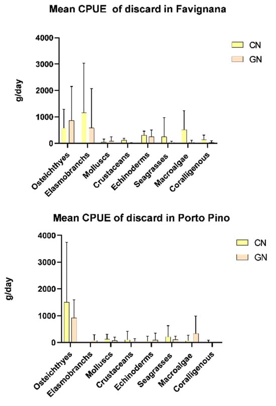 In Porto Pino, the most discarded taxonomic groups with the traditional trammel net were Osteichthyes, with a percentage of 72.06% of total discard and mean CPUE of 1508 ± 2236.95 g/day), and macroalgae, with mean CPUE of 206 ± 213.66 g/day. The most discarded taxonomic group with the guarding net is Osteichthyes, with 55.24% of total discard and a mean CPUE of 921.9 ± 674.48 g/day, followed by macroalgae (20.17% and mean CPUE = 336.81 ± 657.30 g/day) (Figure 9C,D; Figure 10).