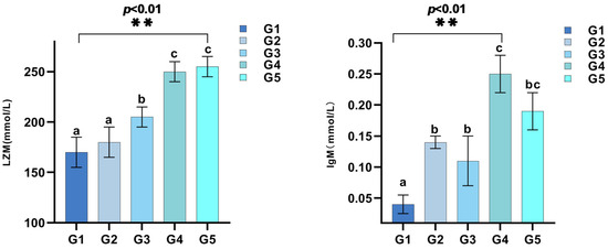 Moreover, different levels of C. butyricum in the diet significantly impacted the activities of LZM and IgM in serum (p < 0.05), with peak activities observed in G4 (Figure 1).