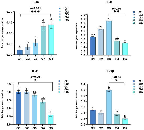 Modulation of interleukin profiles in triploid rainbow trout by dietary C. butyricum supplementation (n = 3). Values in the columns with different superscript letters are significantly different (p < 0.05). * indicates p < 0.05, ** indicates p < 0.01, and *** indicates p < 0.001, representing statistically significant differences.