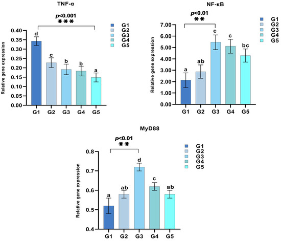 Impact of C. butyricum supplementation on key inflammatory gene expression in triploid rainbow trout (n = 3). Values in the columns with different superscript letters are significantly different (p < 0.05). ** indicates p < 0.01, and *** indicates p < 0.001, representing statistically significant differences.